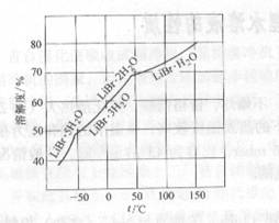 2、溴化鋰在水中的溶解度隨溫度的降低而降低,如圖1所示,圖中的曲線為結(jié)晶線,曲線上的點表示溶液處于飽和狀態(tài),它的左上方表示有固體溴化鋰結(jié)晶析出,右下方表示溶液中沒有結(jié)晶存在,所謂溶解度是指飽和液體中所含溴化鋰無水化合物的質(zhì)量成分,也就是溴化鋰水溶液的質(zhì)量濃度,由圖中曲線可知,溴化鋰的質(zhì)量濃度不宜超過66%,否則運(yùn)行中當(dāng)溶液溫度降低時將有結(jié)晶析出,破壞循環(huán)的正常運(yùn)行;